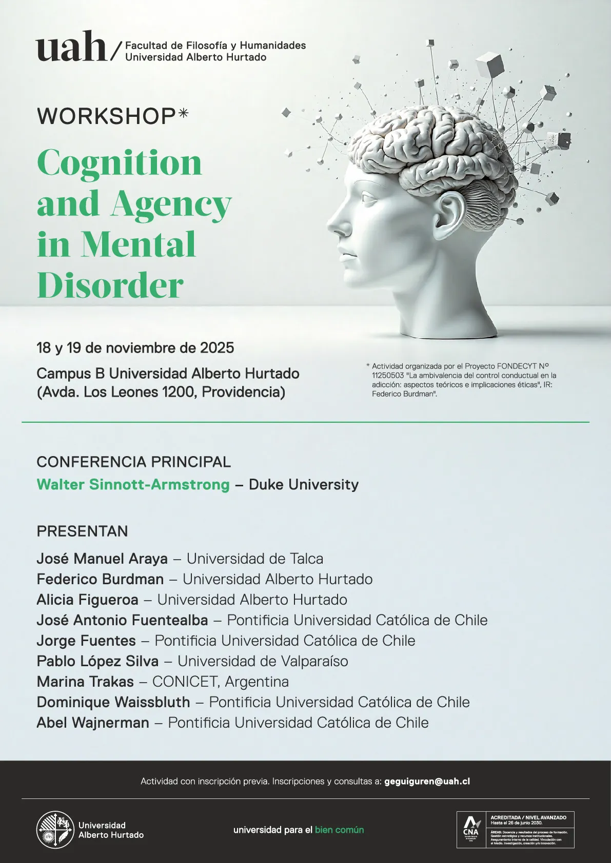 El 18 y 19 de noviembre de 2025, se realizará en el Campus B de la Universidad Alberto Hurtado (Avda. Los Leones 1200, Providencia) el workshop Cognition and Agency in Mental Disorder.